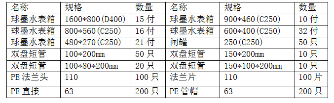 1、采購內容:球墨水表箱、雙盤(pán)短管、閘罐、PE法蘭頭、PE直接等