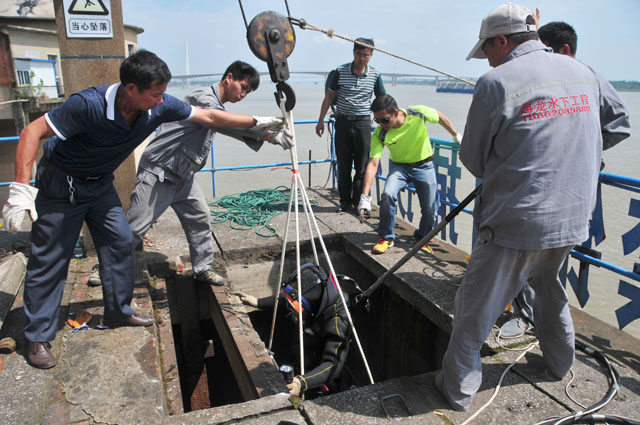 如圖:潛水員下到閘門(mén)井底查檢平板閥門(mén)封閉情況。