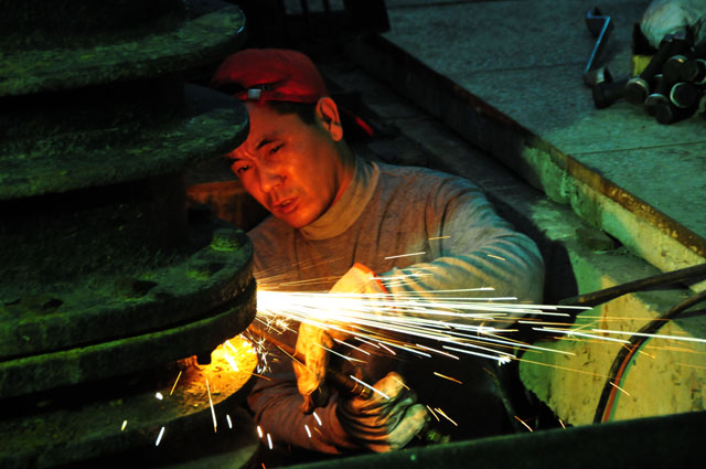 如圖:檢修人員正在拆卸取水機組進(jìn)水閥門(mén)。