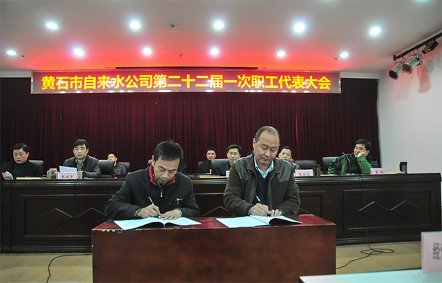 與會(huì )代表認真聽(tīng)取并審議通過(guò)了《公司工作報告》、《黃石市自來(lái)水公司“十三五”供水發(fā)展規劃要點(diǎn)(草案)》、《關(guān)于公司加入武漢城市圈職工重大疾病醫療互助的議案》、《關(guān)于實(shí)行公司制改造的議案》,并對公司領(lǐng)導班子及班子成員進(jìn)行了民主評議。公司總經(jīng)理劉子俊對職工代表提出的生產(chǎn)經(jīng)營(yíng)、職工培訓、智能信息運用、職工福利等方面的意見(jiàn)和建議一一進(jìn)行了解答。他代表公司與各基層單位簽定了《2016年度量質(zhì)化考核責任書(shū)》、《2016年度績(jì)效考核責任書(shū)》。