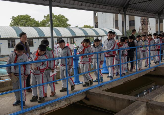 如圖沈家營(yíng)小學(xué)師生在涼亭山水廠(chǎng)參觀(guān)反應池。