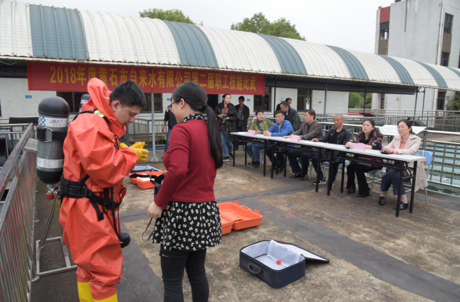 當天上午,首先在公司二樓會(huì )議室舉行了“職工技能比武”理論考試。公司領(lǐng)導高度重視,現場(chǎng)巡視??荚囘^(guò)程中,參考人員和監考人員嚴格遵守考試紀律,參考人員答題認真,監考人員監考嚴格。在下午的實(shí)操考試中,共分為運行值班工比賽、維修電工比賽、水質(zhì)檢驗工比賽以及防化服穿戴等四個(gè)項目。其中,水質(zhì)檢驗工比賽主要測試職工水質(zhì)檢驗工基本理論知識和水質(zhì)日常檢測七項、九項指標基礎理論知識。維修電工比賽需根據安全技術(shù)操作規程完成試題要求。運行值班工比賽以現場(chǎng)答題的方式,回答評委提出的問(wèn)題。防化服穿戴比賽,要求兩人一組相互配合,根據防化服穿戴規范程序在規定的時(shí)間內正確完成穿戴。