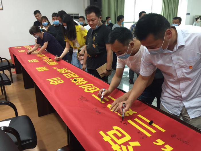 圖為第三、第四紀檢聯(lián)片區干部職工在“建示范、創(chuàng )精品、鑄品牌”橫幅上誓師簽名