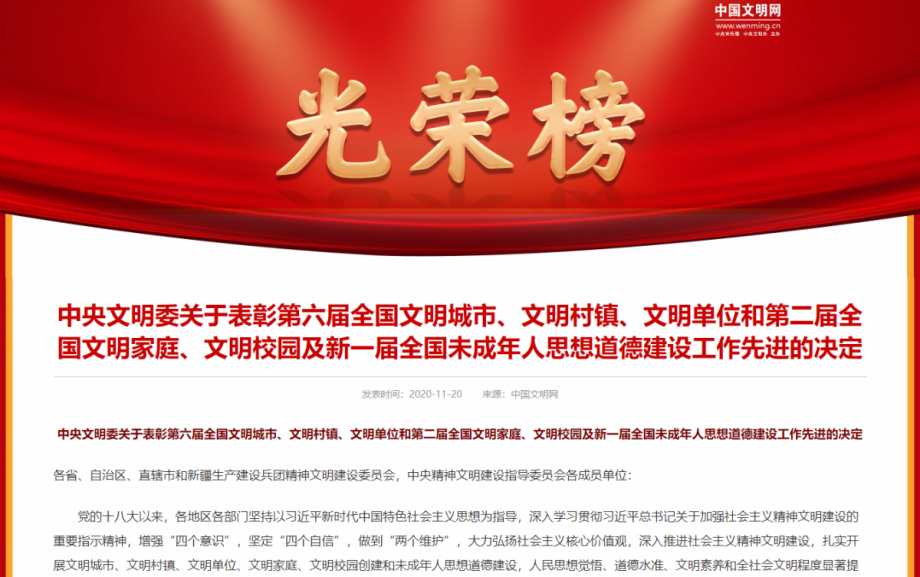 11月20日,《中央文明委關(guān)于表彰第六屆全國文明城市、文明村鎮、文明單位和第二屆全國文明家庭、文明校園及新一屆全國未成年人思想道德建設工作先進(jìn)的決定》正式公布。
