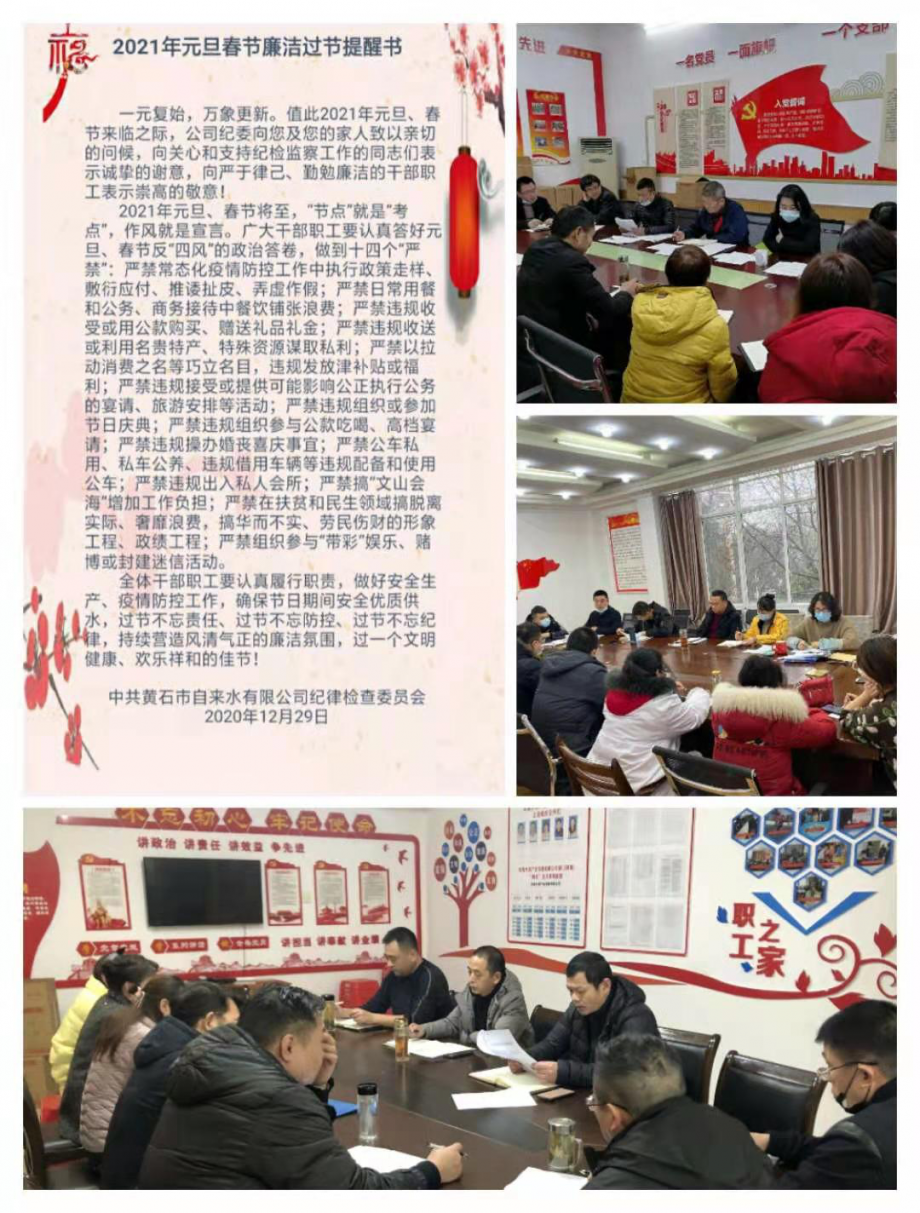 早提醒,打好廉潔“預防針”。公司紀委發(fā)布《廉潔過(guò)節提醒書(shū)》、開(kāi)辦“以案明紀”專(zhuān)欄,全員教育提醒;對重點(diǎn)領(lǐng)域和關(guān)鍵環(huán)節單位、部門(mén)集體廉政談話(huà),增強“免疫力”;全體紀檢干部撰寫(xiě)十九屆中紀委五中全會(huì )公報學(xué)習心得,提升執紀能力。公司各級黨組織嚴明紀律要求共開(kāi)展學(xué)習14次,繃緊節日廉潔自律弦。