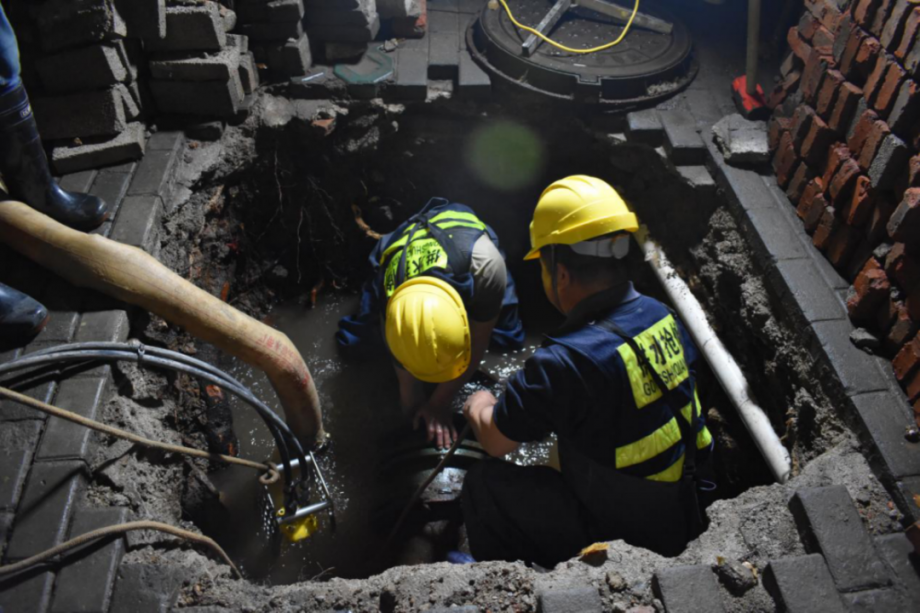 一路風(fēng)塵仆仆,濕透的衣服一直未曾干過(guò)。下午17時(shí)許,維修人員結束下陸萬(wàn)達廣場(chǎng)的檢測后匆匆趕到環(huán)湖路交警大隊。這里一處水管漏水,水滲透地面,向四周漫延,附近居民水壓低,著(zhù)急等待搶修人員到來(lái)。在漏水的位置確定好漏點(diǎn)后,搶修人員開(kāi)始犯難了,漏水的地方位于外墻被圍欄環(huán)繞的花壇里,機器無(wú)法開(kāi)挖。維修人員只有采取人工挖。為避免破壞花壇植被和花壇中PE110戶(hù)表管,王明躍決定從花壇底部開(kāi)挖。一鍬接一鍬、一鏟連一鏟,太陽(yáng)漸漸隱藏余暉,卻依然肆意散發(fā)著(zhù)巨大的熱量,夏天不能暢快用水煎熬著(zhù)用戶(hù)的心,成為工人們感同身受的干事動(dòng)力。管道挖掘和搶修一直持續至次日凌晨3時(shí)左右,維修人員連續10余小時(shí)的作業(yè),挖出DN300鑄鐵管,焊接好鑄鐵管上60厘米裂縫,恢復片區供水。