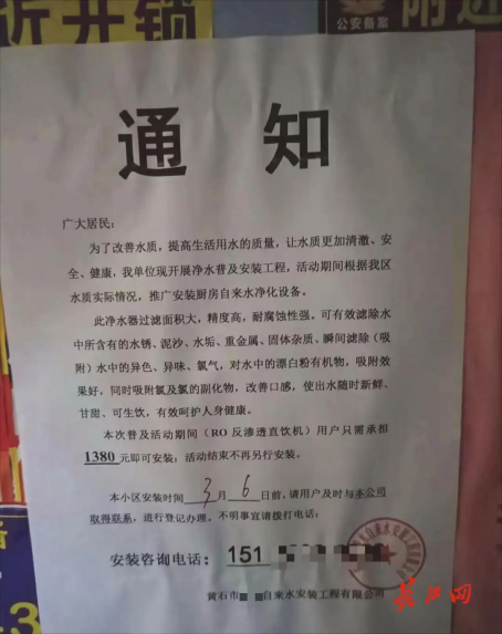 馬先生說(shuō),他看到小區的門(mén)口貼著(zhù)一張通知,上面寫(xiě)著(zhù)黃石市某自來(lái)水安裝工程公司在該小區開(kāi)展業(yè)務(wù),只需要掏1380元,就可安裝“OR反滲透直飲機”。聽(tīng)到自家的水質(zhì)不達標后,馬先生有些擔心家人飲用自來(lái)水影響健康,可又覺(jué)得要花1380元不劃算,于是致電向黃石市水務(wù)集團,質(zhì)疑安裝費過(guò)高。