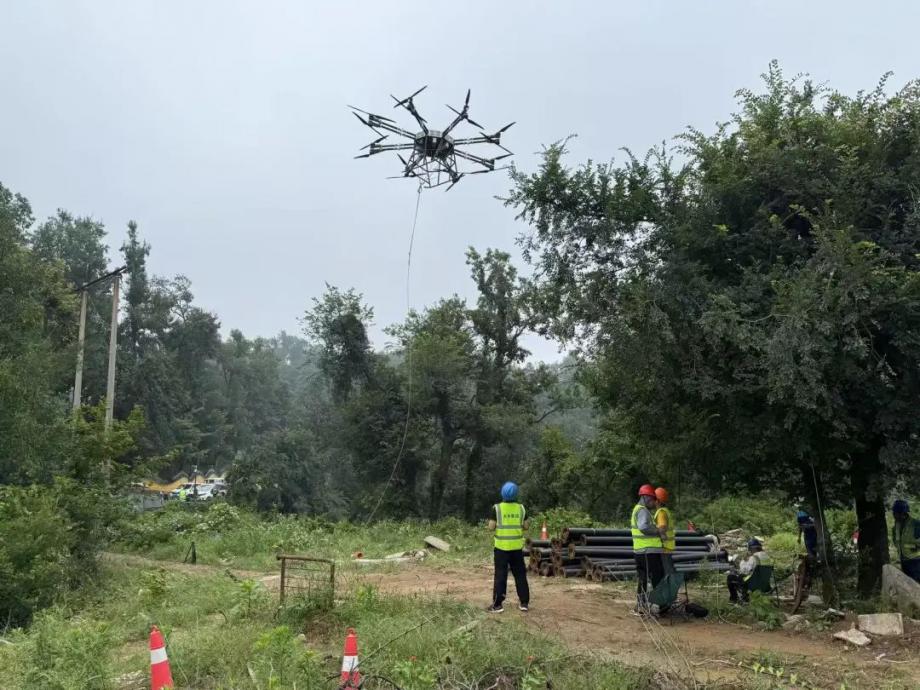 圖為市水務(wù)集團首次引入無(wú)人機運輸技術(shù),在東方山加壓供水系統改造工程中,將4公里管道運送至海拔落差近400米的山間。