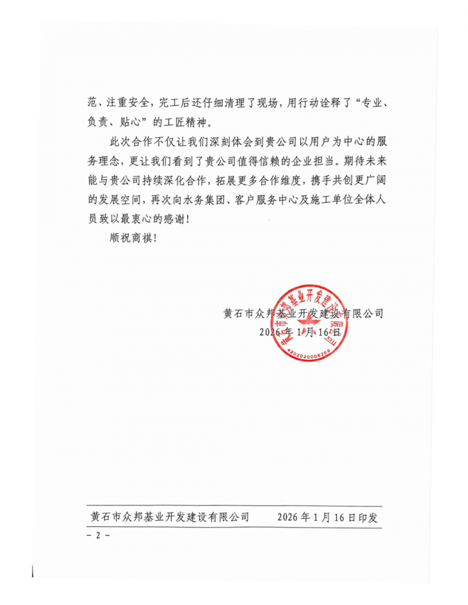 “此次合作讓我們深刻體會(huì)到水務(wù)集團(tuán)以用戶為中心的服務(wù)理念,更看到了值得信賴的企業(yè)擔(dān)當(dāng)?!北姲罨鶚I(yè)開發(fā)公司在感謝信中表示,期待未來與水務(wù)集團(tuán)持續(xù)深化合作,拓展更多合作維度。